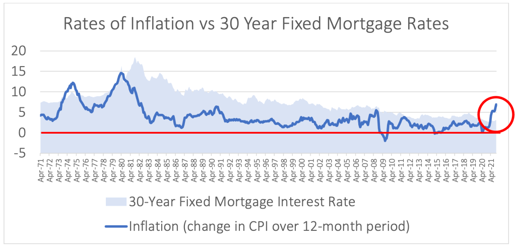 The chart above compares the rate of inflation defined as the change in the Consumer Price Index over a 12-month period (data from Bureau of Labor Statistics) against 30-year fixed mortgage rates (data from Freddie Mac) for the last 50 years. As you can see, there is a relationship between the two, and the sharp inflation we see currently is circled on the graph above and is quite evident. Historically, an inflation rate increase like we are seeing currently would have resulted in curtailing action from the Fed and mortgage interest rates would see a strong increase.